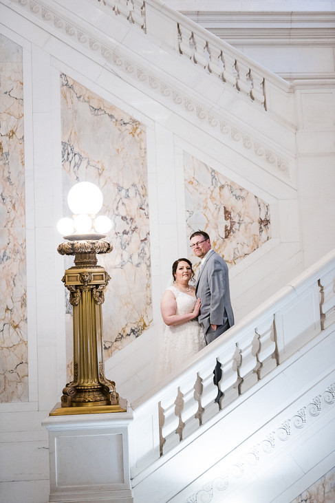 We started our day at the Hotel Monaco In downtown Baltimore, Maryland. It's a gorgeous historic property with the most iconic white marble stairs that EVERY bride dreams about having her first look and wedding photos taken on. Tabitha and James both decided to do a first look and the get as much portrait work completed prior to the ceremony. Not every couple wants a first look, and I support that 100%. Sometimes it just works for the wedding day and there are times when it doesn't. This time it worked out perfectly. Seeing my sweet friend walking down the stairs to see her soon to be husband made me well up with the happiest of tears. From there we drove to the Abbott Memorial Presbyterian Church, the church where Tabitha and James met. The ceremony was absolutely beautiful! The Church as this incredible staircase that leads down from the bridal suite with the most lovely stained glass windows. What I love about old churches, especially in Baltimore City are the design and layouts. They have incredible character are are just as unique as the families that call them home. The pews were full of family and close friends all brought together by Tabitha and James and we sealed the deal at the end with a confetti canons!!
